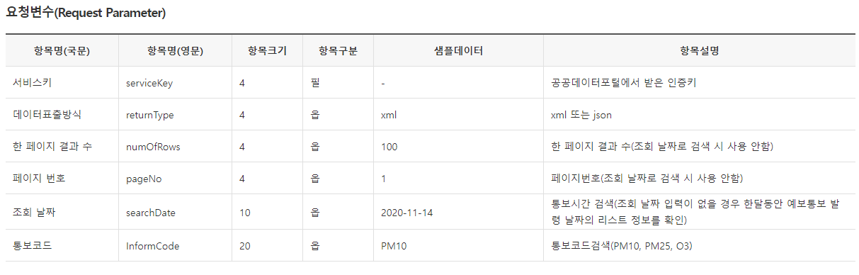 http://apis.data.go.kr/B552584/ArpltnInforInqireSvc/getCtprvnRltmMesureDnsty?serviceKey=본인 서비스 키&returnType=json&numOfRows=1&pageNo=1&sidoName=서울&ver=1.0